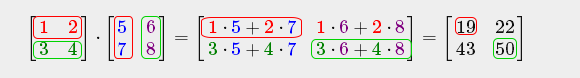 \begin{bmatrix} \textcolor{red}1 & \textcolor{red}2 \\ \textcolor{green}3 & \textcolor{green}4 \end{bmatrix} \cdot \begin{bmatrix} \textcolor{blue}5 & \textcolor{purple}6 \\ \textcolor{blue}7 & \textcolor{purple}8 \end{bmatrix} = \begin{bmatrix} \textcolor{red}1 \cdot \textcolor{blue}5 + \textcolor{red}2 \cdot \textcolor{blue}7 & \textcolor{red}1 \cdot \textcolor{purple}6 + \textcolor{red}2 \cdot \textcolor{purple}8 \\ \textcolor{green}3 \cdot \textcolor{blue}5 + \textcolor{green}4 \cdot \textcolor{blue}7 & \textcolor{green}3 \cdot \textcolor{purple}6 + \textcolor{green}4 \cdot \textcolor{purple}8 \end{bmatrix} = \begin{bmatrix} 19 & 22 \\ 43 & 50 \end{bmatrix}