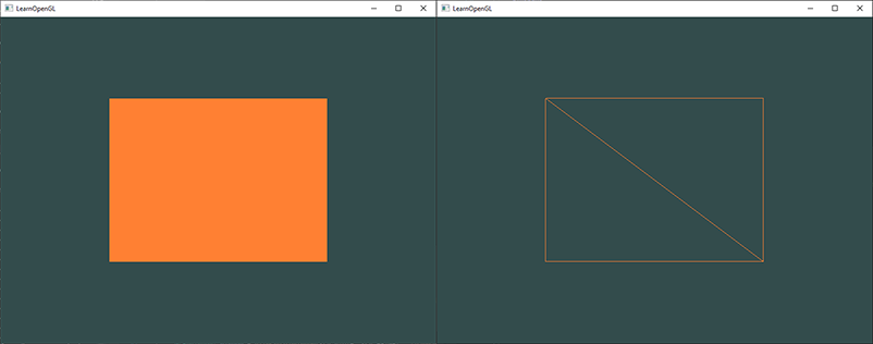 프로그램을 실행하면 아래 그림과 같은 이미지가 나타납니다. 왼쪽 이미지는 익숙할 것이고, 오른쪽 이미지는 와이어프레임 모드(wireframe mode)로 그려진 사각형입니다. 와이어프레임 사각형을 보면 사각형이 실제로 두 개의 삼각형으로 구성되어 있음을 알 수 있습니다.