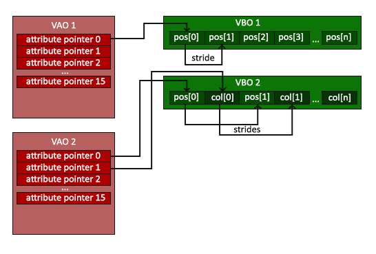 객체를 그릴 때마다 이 과정을 반복해야 합니다. 언뜻 보기에는 별것 아닌 것처럼 보일 수 있지만, 정점 속성이 5개 이상이고 객체가 수백 개에 달한다고 가정해 보세요(이는 흔한 경우입니다). 각 객체에 맞는 버퍼 객체를 바인딩하고 모든 정점 속성을 설정하는 것은 금세 번거로운 작업이 됩니다. 만약 이러한 모든 상태 설정을 하나의 객체에 저장하고, 해당 객체를 바인딩하여 상태를 복원할 수 있는 방법이 있다면 어떨까요?