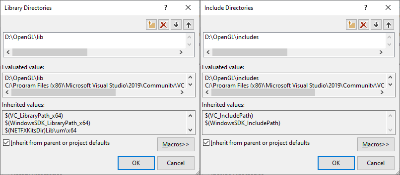 여기에 원하는 만큼 추가 디렉터리를 추가할 수 있으며, 추가된 디렉터리부터 IDE는 라이브러리 및 헤더 파일을 검색할 때 해당 디렉터리도 검색합니다. GLFW의 Include 폴더를 포함시키면 <GLFW/..>를 통해 GLFW의 모든 헤더 파일을 찾을 수 있습니다. 라이브러리 디렉터리에도 동일하게 적용됩니다.